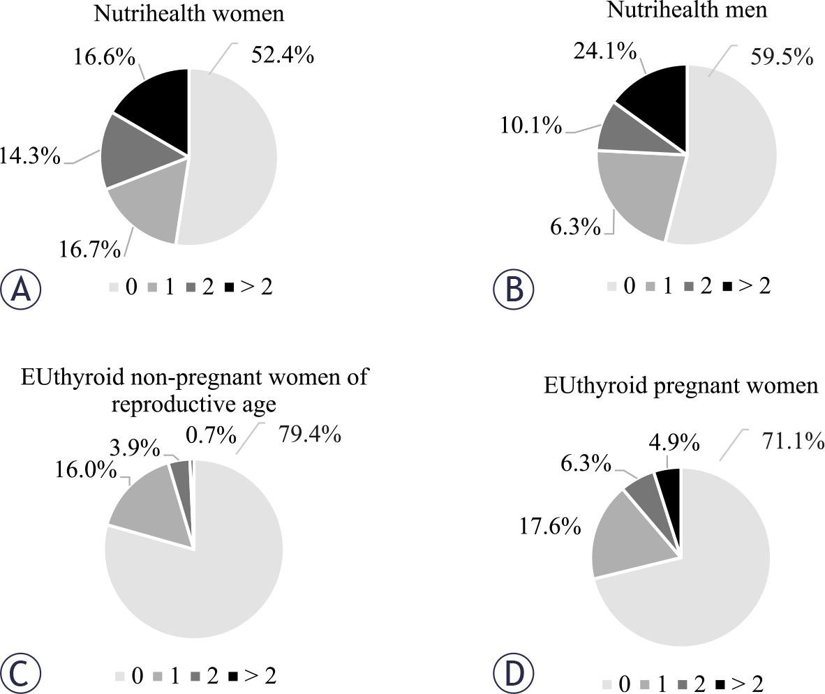 | Nutrihealth women N = 126 | Nutrihealth man N = 79 | EUthyroid women of reproductive age N = 305 | EUthyroid pregnant women N = 142 | |||||