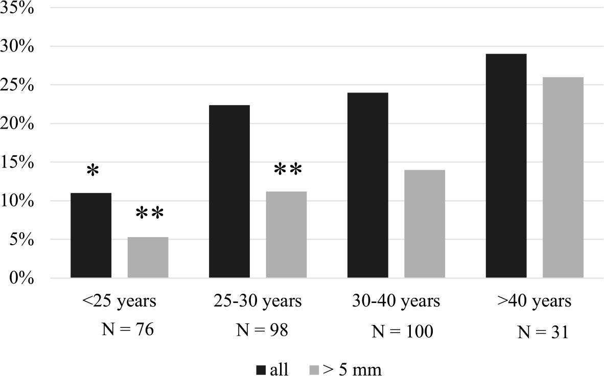 | Proportion of women with nodules > 5 mm (number, %) | 63** (14.1) | 37** (12.1) | 26** (18.3) | 0.082 |