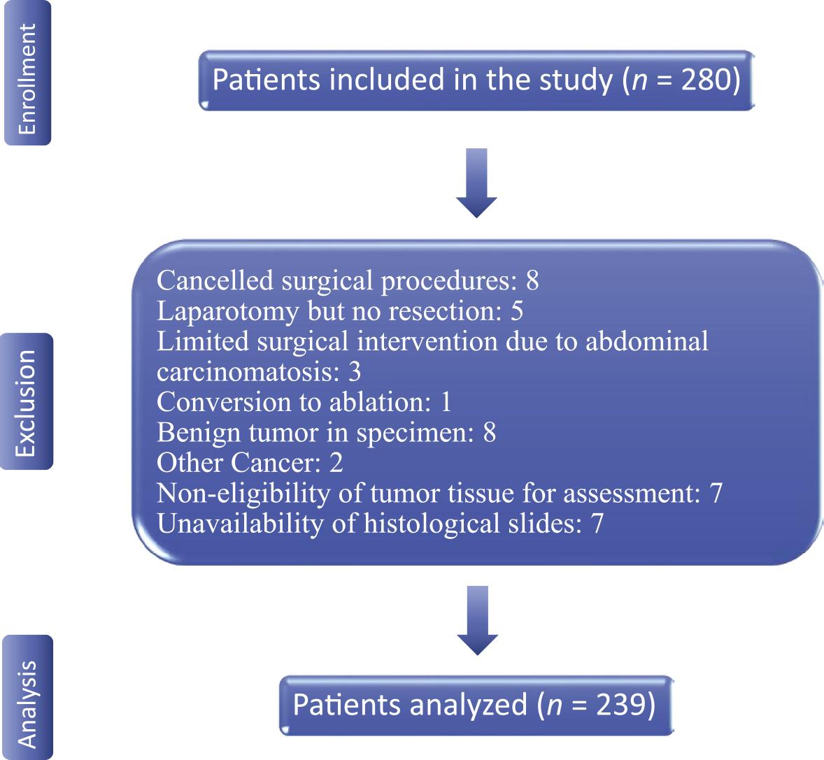 | Previous liver resection | 29 (12%) | 13 (13%) | 6 (11%) | 5 (16%) | 5 (10%) | 0.896 |