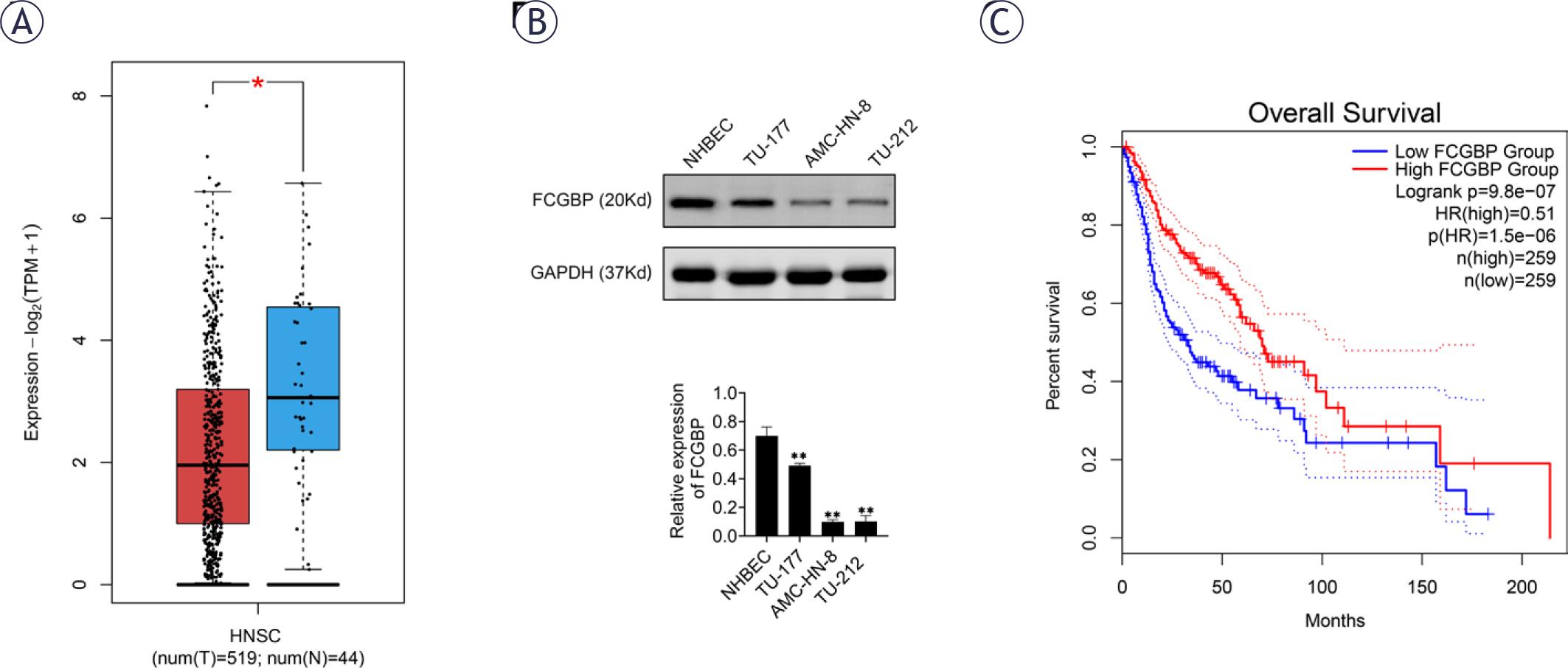 Fc binding protein (FCGBP) is downregulated in laryngeal squamous cell carcinoma (LSCC). (A) The Gene Expression Profiling Interactive Analysis 2 (GEPIA2) database showing differential FCGBP expression between head and neck squamous cell carcinoma tissues and normal tissues. (B) Western blot analysis of FCGBP protein expression in LSCC cell lines (AMC-HN-8, TU-212, TU-177) and normal human bronchial epithelial cells (NHBEC). (C) GEPIA analysis of the association between FCGBP expression and overall survival in LSCC patients. Values are presented as mean ± SD. ** p < 0.01 vs. NHBEC; n = 3.