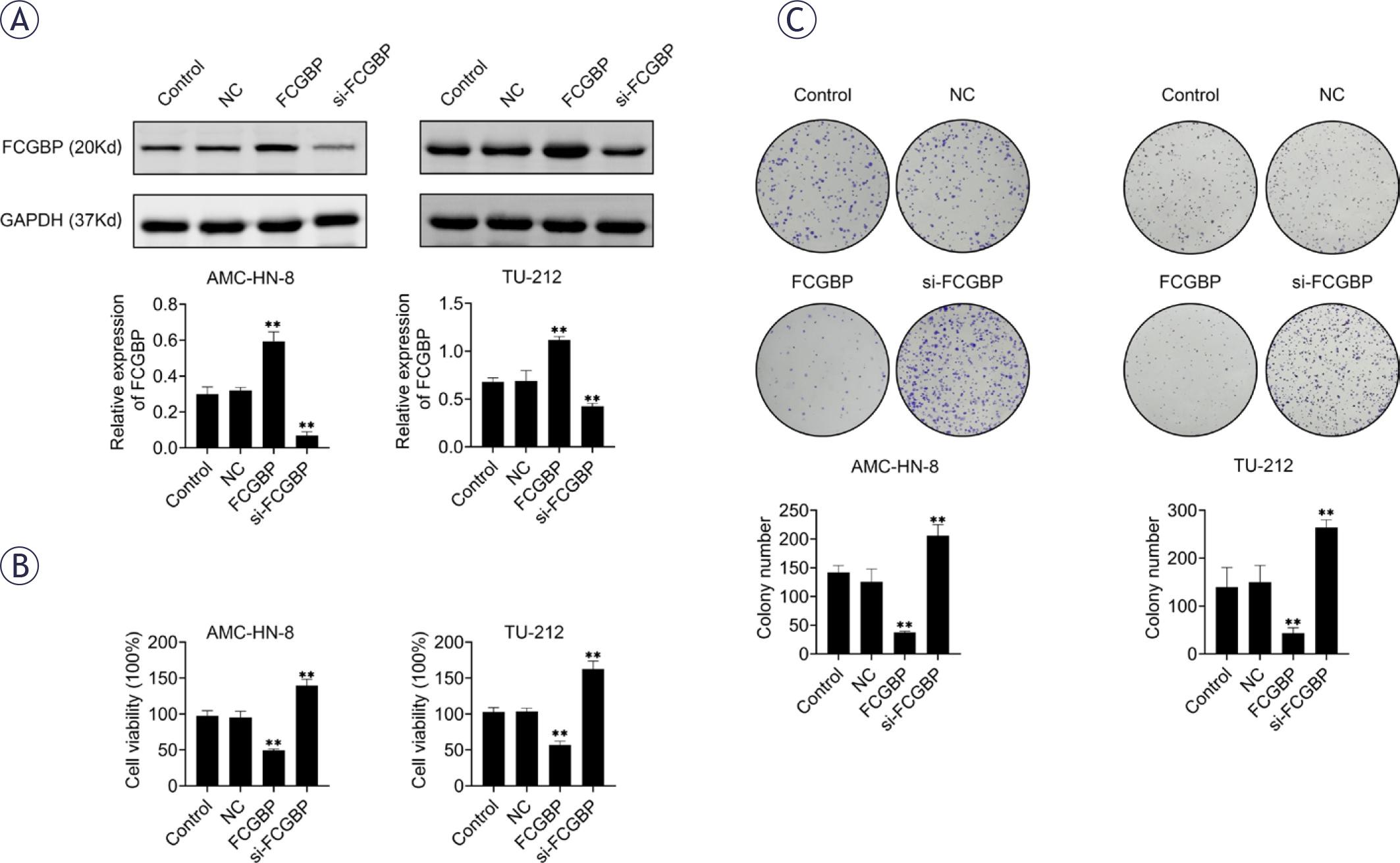 Fc binding protein (FCGBP) inhibits the proliferation of laryngeal squamous cell carcinoma (LSCC) cells. (A) Western blot analysis confirming FCGBP overexpression in AMC-HN-8 and TU-212 cells. (B) Cell viability measured by Cell Counting Kit-8 (CCK-8) assay. (C) Colony formation assessed by crystal violet staining. Values are presented as mean ± SD. ** p < 0.01 vs. NC; n = 3.