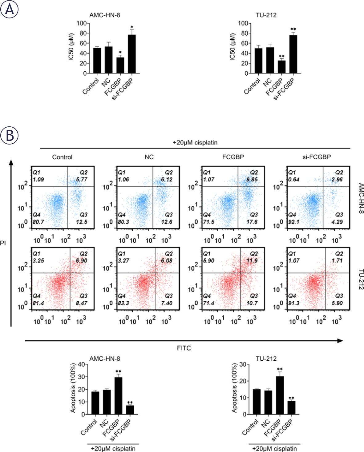 Fc binding protein (FCGBP) reduces cisplatin (CDDP) resistance in laryngeal squamous cell carcinoma (LSCC). (A) Cell Counting Kit-8 (CCK-8) assay used to determine the IC50 of CDDP in AMC-HN-8 and TU-212 cells. (B) Flow cytometry analysis of apoptosis following treatment with 20 μM CDDP. Values are presented as mean ± SD. * p < 0.05, ** p < 0.01 vs. NC; n = 3.