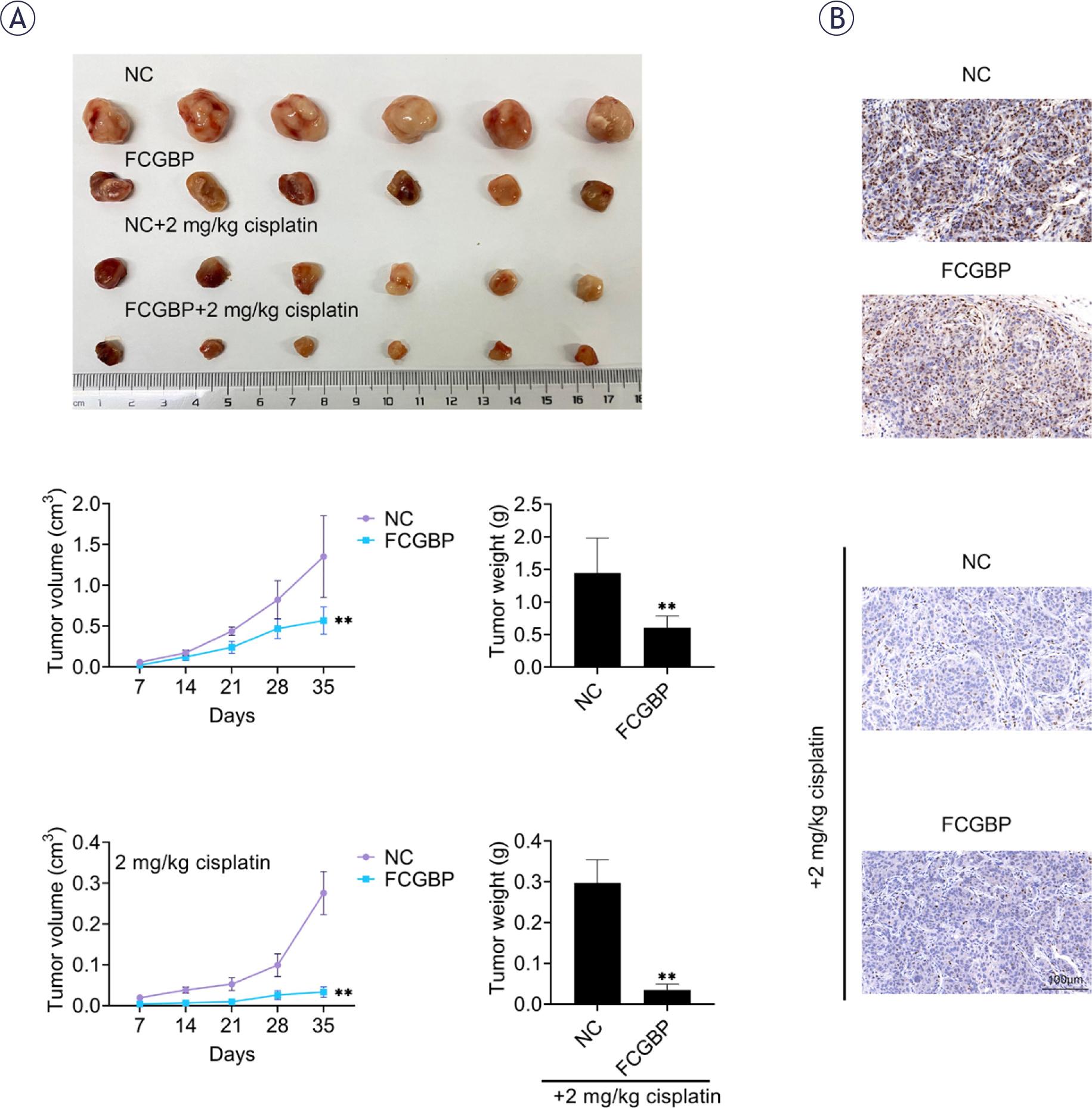 Fc binding protein (FCGBP) suppresses tumor growth and enhances cisplatin (CDDP) sensitivity in vivo. (A) Tumor size and weight in xenograft models. (B) Immunohistochemical staining of Ki-67 in tumor sections. Values are presented as mean ± SD. ** p < 0.01 vs NC. n=6.