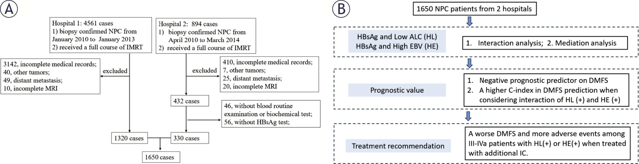 Therefore, the principal aim of our study was to explore the complex interplay between HBsAg, EBV, and pre-treatment ALC and their correlation with distant metastasis in NPC. We sought to determine whether these factors could serve as predictive markers for the benefits derived from the addition of IC in a large, homogeneous cohort of patients with NPC from two independent hospitals.