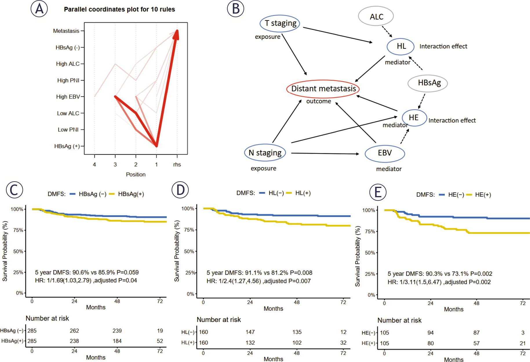 Association rules, directed acyclic graph, and prognostic value of HBsAg, EBV, and ALC on DMFS. (A) The top 10 association rules related to HBsAg (+) demonstrated strong associations among high EBV, low ALC, and HBsAg (+) with distant metastasis in patients with NPC. (B) The directed acyclic graph (DAG) shows the associations among variables. Significant interactions were observed between HBsAg and plasma EBV DNA load, HBsAg, and ALC, defined as HE and HL. In the mediation analysis, EBV and HE mediated the effect of N staging on distant metastasis, and HL mediated the effect of T staging on distant metastasis. After 1:1 random matched analysis (C–E), HBsAg (+), HL (+), and HE (+) were the independent adverse prognosticators of DMFS in patients with NPC.