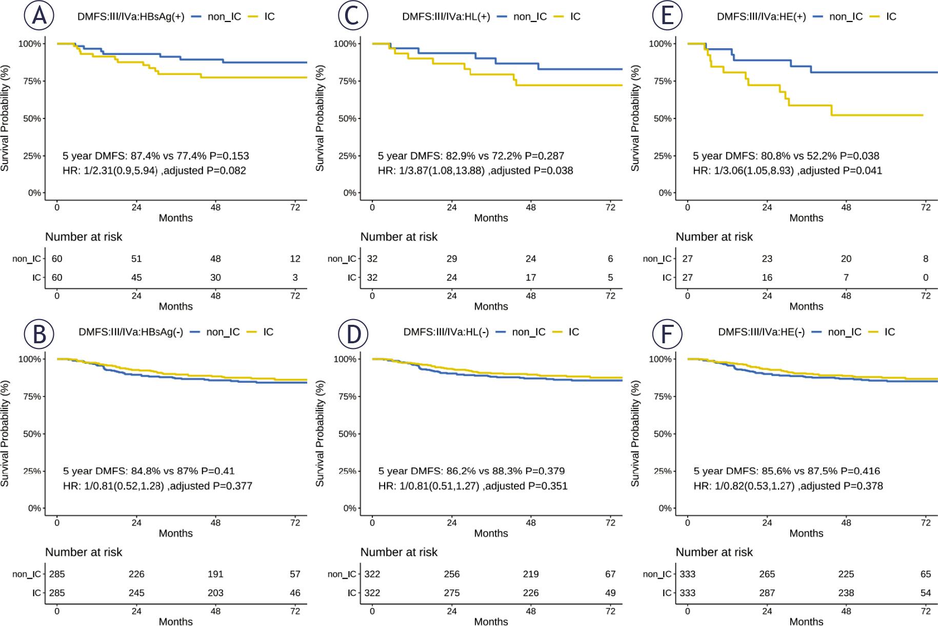 Among patients with stage III–IVa NPC positive for HBsAg, the 5-year DMFS of the IC group was not significantly worse than that of the non-IC group. In patients with NPC with interaction associations, those who received additional IC presented with a worse 5-year DMFS than those who did not receive additional IC, both in HL (+) (82.9% vs. 72.2%, P = 0.287; HR: 3.87, 95% CI: 1.08–13.88, adjusted P = 0.038) and HE (+) (80.8% vs. 52.2%, P = 0.038; HR: 3.06, 95% CI: 1.05–8.93, adjusted P = 0.041) groups. Conversely, in patients without HBV infection and interaction association, there was an overlap in the 5-year DMFS, regardless of additional IC administration (Figure 3). Moreover, a better 5-year OS was observed among patients with stage III-IVa NPC receiving additional IC than among those treated without IC, whether they were classified into the HBsAg (-), HL (-), or HE (-) group. No significant treatment benefits were obtained in the 5-year OS for those in the HBsAg (+), HL (+), or HE (+) groups (Supplementary Figure 3).