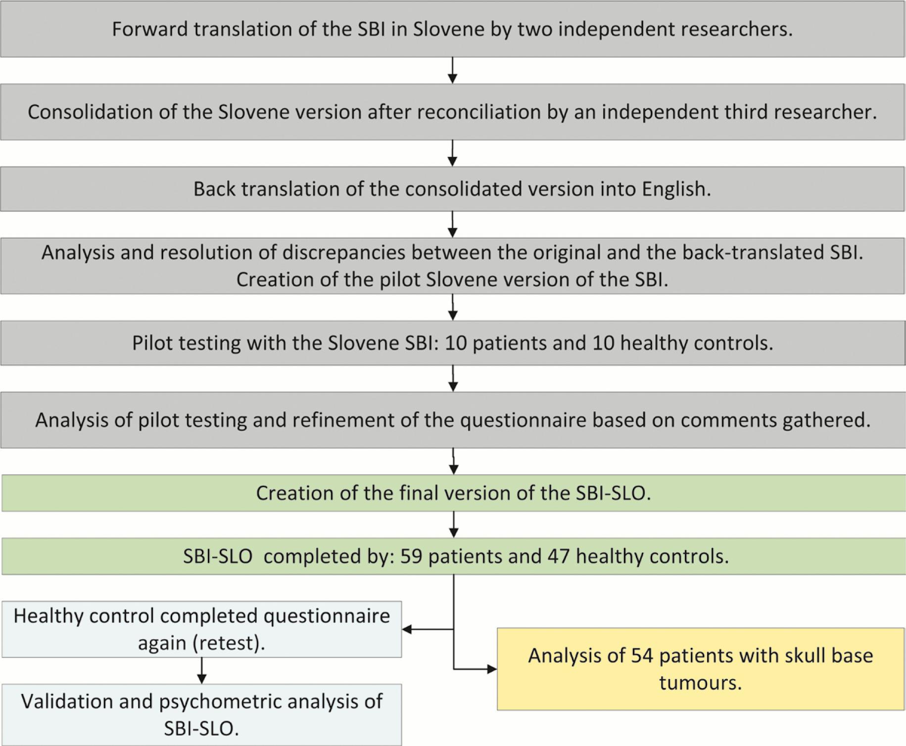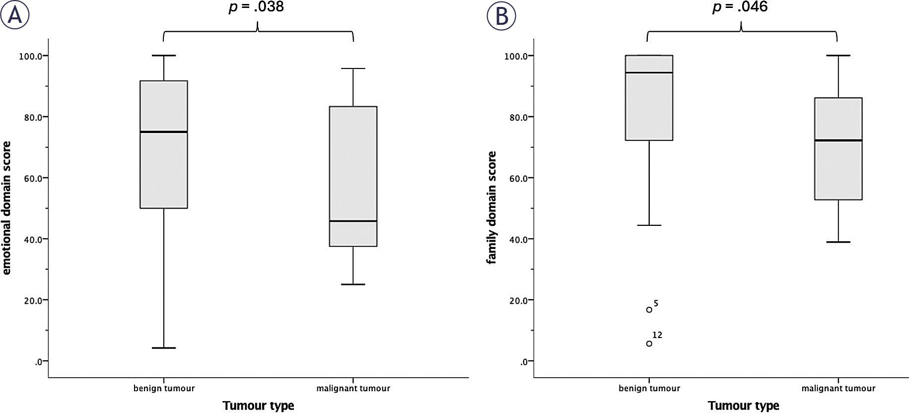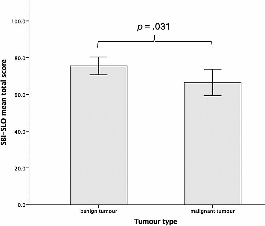 Differences in scores of Slovenian version of Skull base inventory between patients with benign and malignant skull base tumours