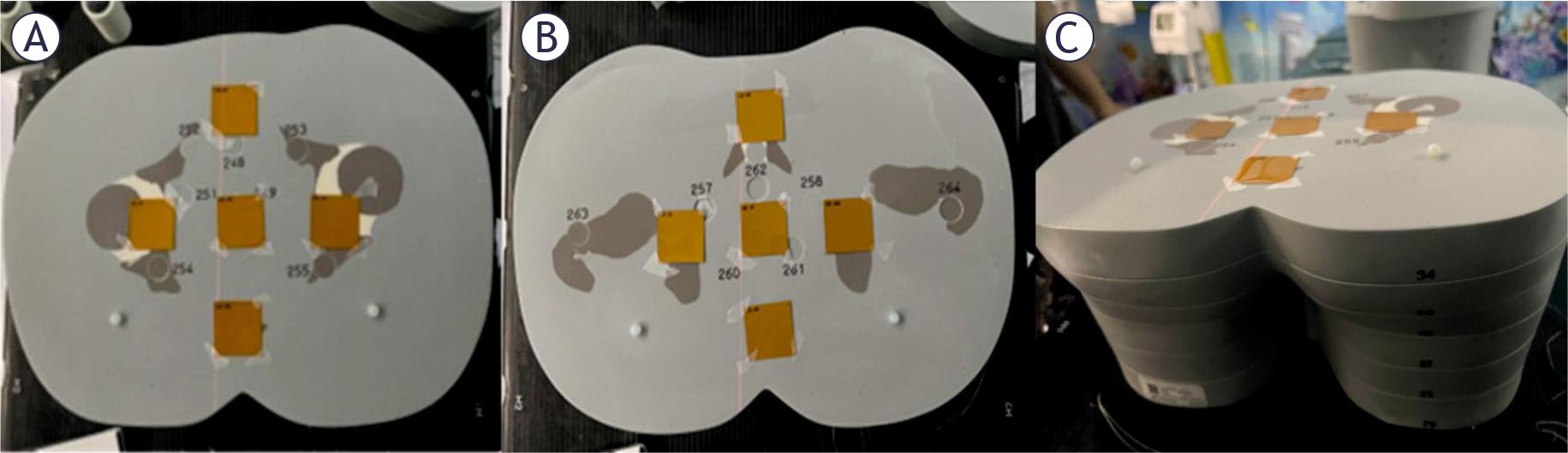 Positions of LD-V1 films in the anthropomorphic phantom. Panel (A) shows film positions between slabs 33 and 34, and panel (B) between slabs 34 and 35. Panel (C) shows a side view of the phantom with films on top of slab 34 (corresponding to panel (A)).