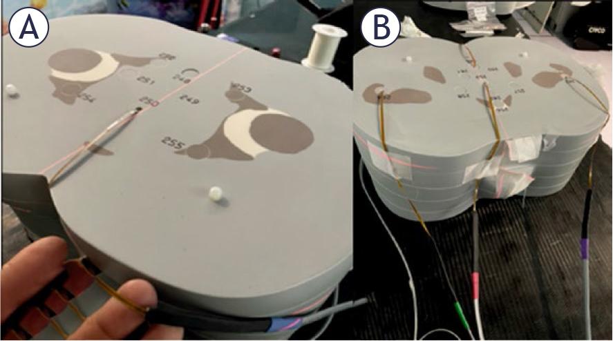 The LD-V1 film’s response to the irradiation direction was evaluated under two configurations: (i) with the beam axis aligned parallel to the film surface, and (ii) with the beam axis-oriented perpendicular to the film surface. Validation measurements were performed by averaging doses from four CBCT scans of the anthropomorphic phantom, using the scanning protocol of Table 1. Ten LD-V1 film pieces (3 cm × 3 cm) were placed between phantom slabs, as illustrated in Figure 2. Five films were positioned between slabs 33 (Figure 2A) and 34, and another five films between slabs 34 (Figure 2B) and 35. Slab 34 was located above the isocentre plane, while films on slab 35 were aligned with the isocentric plane. In both positions, one film was placed in the centre, and four films at 3, 6, 9, and 12 o’clock positions with about 3 cm spacing between them.