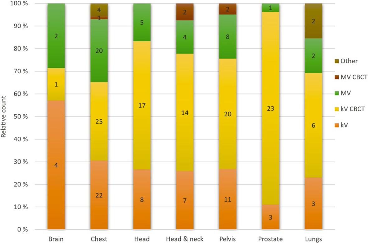 Patient positioning imaging was used across all clinical sites. Treatment sites with more than four answers are shown in Figure 5. Sites with less than four answers were spine (3 answers), stomach (2 answers) and mediastinum (2 answers). In two cases, no treatment site was specified. kV-CBCT and planar kV imaging were the most widely used modalities. Other patient positioning techniques than kV/MV CBCT and planar imaging were surface-guided positioning, Calypso (Varian Medical Systems, Inc), and magnetic resonance imaging.