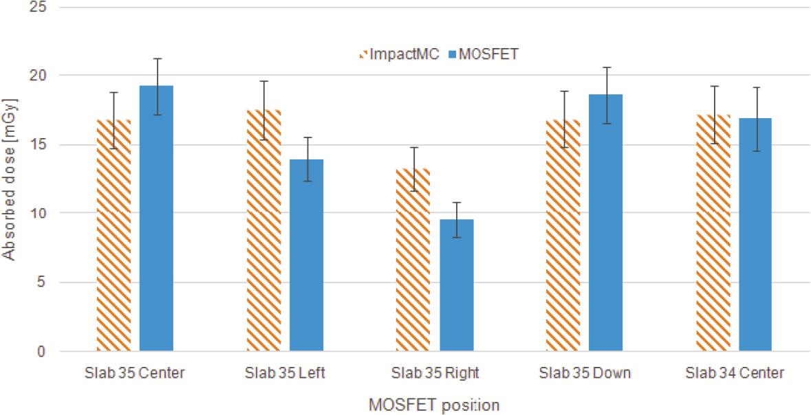 MOSFET measurements in anthropomorphic phantom agree within uncertainties with the simulated results in all cases except for right position (Figure 6). The largest discrepancies between MOSFET and simulated doses were in the right and left MOSFET positions at slab number 35 where the simulated mean doses in ROI were 39% and 25% higher than the measured doses. The doses at the centre of slabs number 35 and 34 and the down position agreed within 13%. In all positions except right the doses were compatible within the uncertainties.