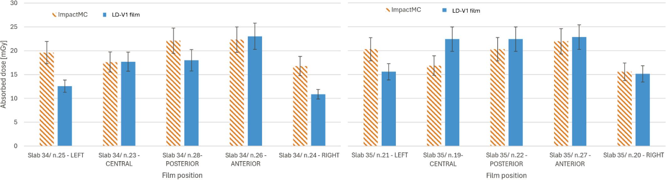 Comparison of LD-V1 film measurements in anthropomorphic phantom with simulated doses. Data for slab number 34 is shown in the left panel, for slab number 35 in the right panel.