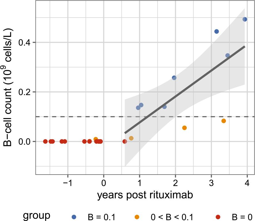 | Years post rituximab | 0.10 | 0.03 | 3.32 | 9 | 0.009 | 0.03 | 0.18 |