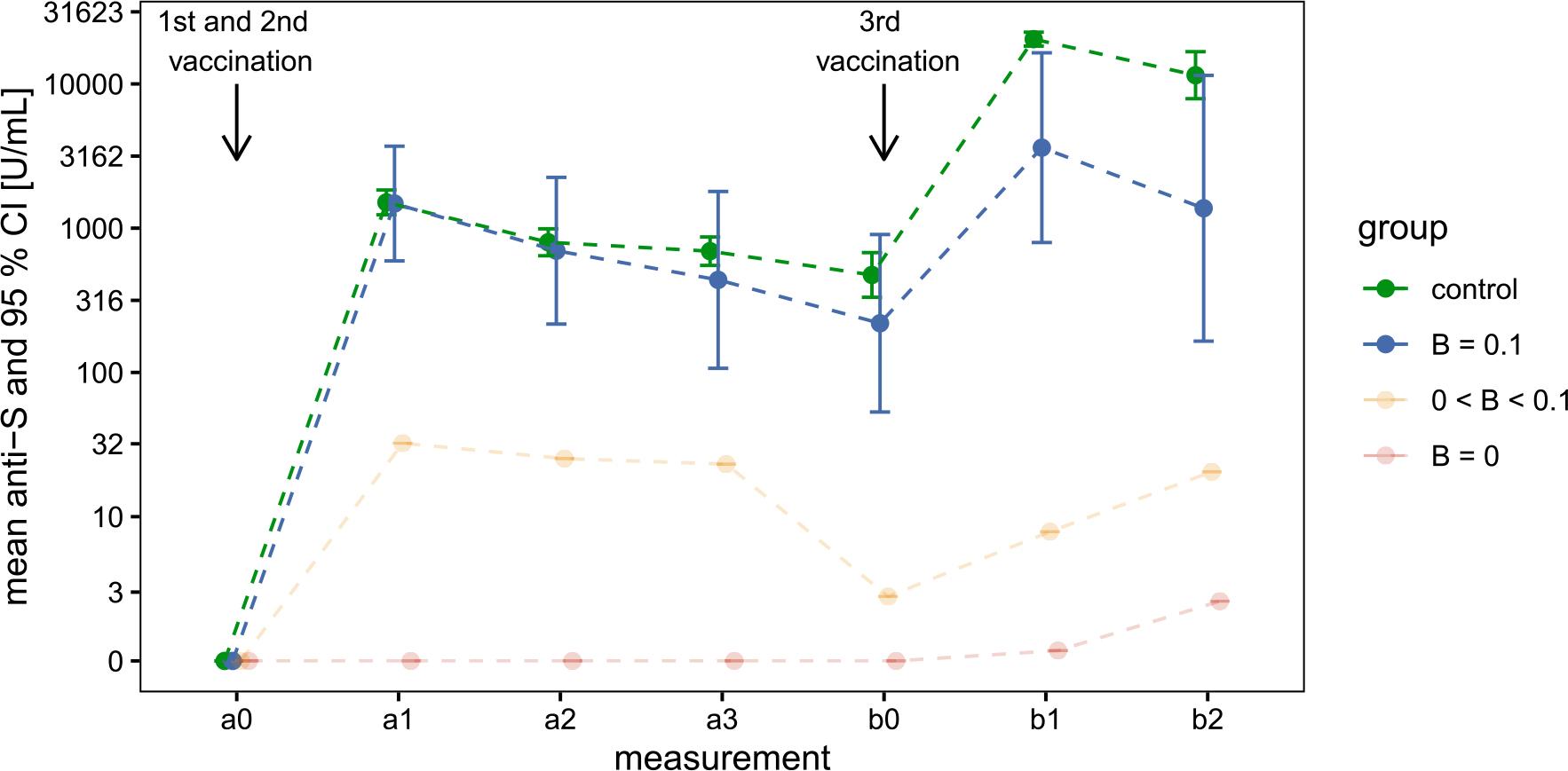 Welch’s t-test results for log-transformed anti-S antibody concentrations (U/mL), comparing the B > 0_1 × 109 cells/L group with the volunteer group at 14 days post-primary and post-booster vaccination