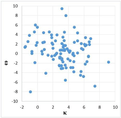 The values of the Pearson correlation coefficient, calculated according to formula (1) for each pair of values are as follows: rĸα = –0.364, rαω = 0.051, rĸω = –0.138. Since the correlation coefficient for the quantities α and ω is very close to zero, we can therefore assert that there is no linear relationship between the quantities. Value rĸω indicates a weak inverse linear relationship and rĸα indicates a moderate connection. The verification of the significance of the linear association for these coefficients according to the Romanovsky criterion led us to the conclusion that there is no pairwise linear relationship between the values α andω, ĸ andω, and there exists a moderate connection between ĸ and α.
