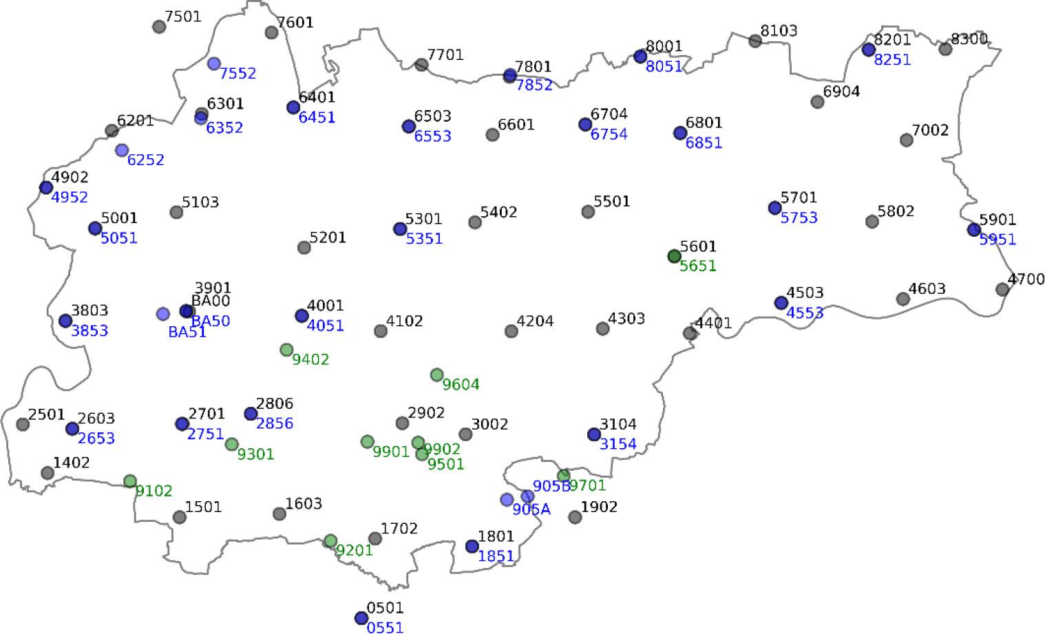 First survey campaign – sessions 1–17_ Point selected for second measurement are in bold_ Second measurement – sessions 18–24 (shaded grey)