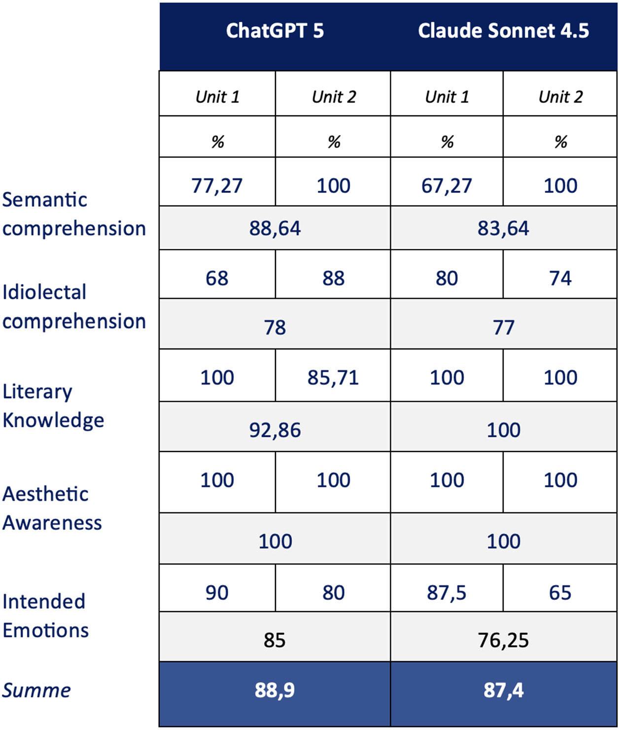 ChatGPT-5 succeeds in capturing textually intended emotions in 85% of cases, while Claude Sonnet-4.5 achieves only 76.25%. In Unit 1, ChatGPT-5 reaches 90% correct solutions, while Claude Sonnet-4.5 comes to 87.5%. In Unit 2, ChatGPT-5 achieves 80%, while Claude Sonnet-4.5 even only reaches 65%.