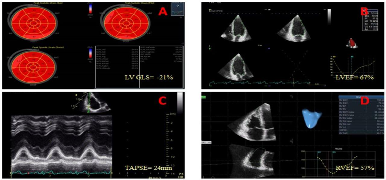Baseline echocardiographic evaluation of left ventricular and right ventricular function. Panel A. Normal range left ventricular 2D global longitudinal strain value; Panel B. 3D echocardiographic quantification of left ventricular volumes and ejection fraction showed values within normal limits; Panel C. M-mode analysis with normal tricuspid annulus systolic excursion; Panel D. 3D echocardiographic assessment of the right ventricle revealed also normal volumes and function.