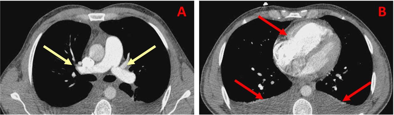 Thoracic computed tomography. Panel A. Thoracic CT scan with contrast revealed an optimal opacification of pulmonary arteries, without thrombi; Panel B. Dilated right heart chambers, mild pleural effusion and no pulmonary parenchymal pathology.
