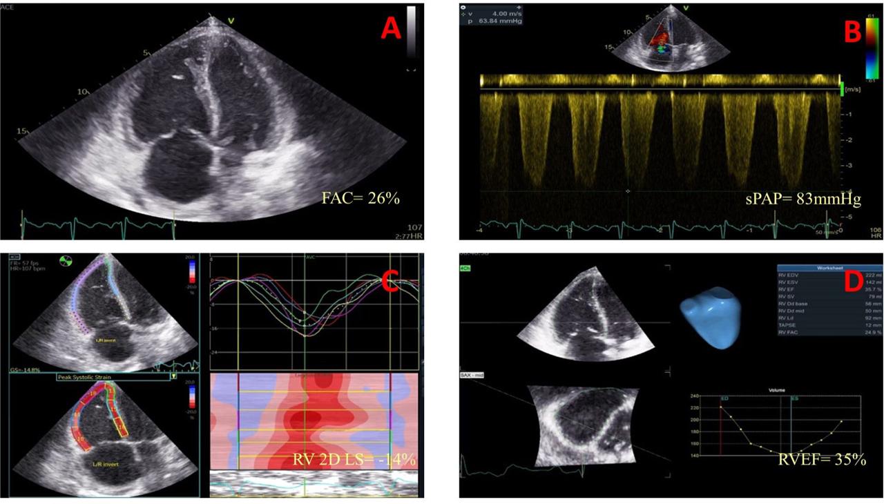 Echocardiographic assessment after five months when the patient presented relapse of the hematological disease with severe hyperviscosity syndrome revealed impaired right ventricular function. Panel A. Decreased fractional area change value; Panel B. CW interrogation of tricuspid regurgitant jet indicated maximum gradient of 63mmHg, with estimated systolic pulmonary artery pressure of 83mmHg suggesting severe pulmonary hypertension; Panel C. Reduced 2D right ventricular free wall longitudinal strain; Panel D: 3D echocardiographic quantification with reduced right ventricular ejection fraction.