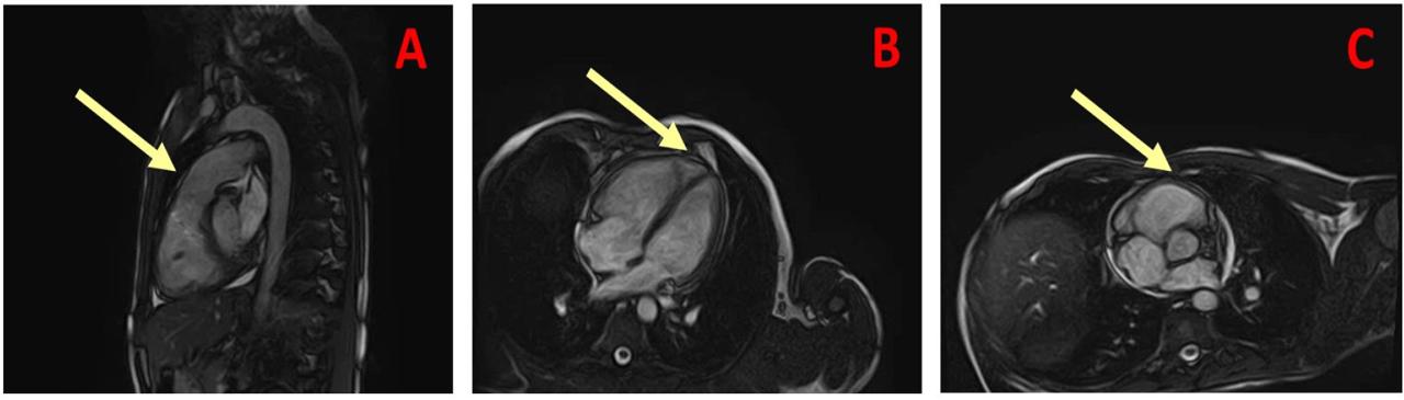 Cardiac magnetic resonance imaging was performed in order to provide additional information on the possible pathophysiological mechanism of cardiac injury. Panel A. MRI confirmed right heart dysfunction, with a RVEF of 31%; Panel B and C. There was no evidence of edema or lipomatous changes on T1 and T2 sequences. Late gadolinium enhancement was confined only to the septal insertion of right ventricular free wall.