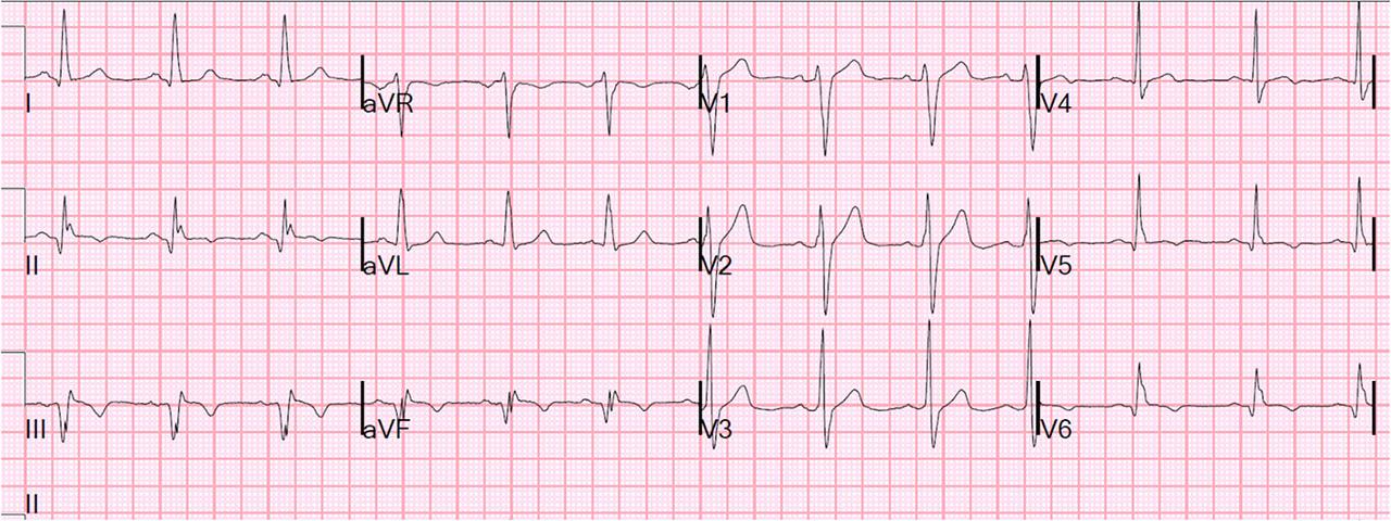 12-lead electrocardiogram (ECG) after successful resuscitation showing sinus rhythm and old inferior infarct (similar to old ECGs).