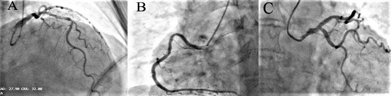 Coronary angiography. Panel A: The left anterior descending artery (LAD) showing permeable proximal stent and no other significant stenosis; Panel B: Right coronary artery (RCA) with proximal plaque with no angiographic significance; Panel C: Left circumflex artery (LCX) with no lesions.