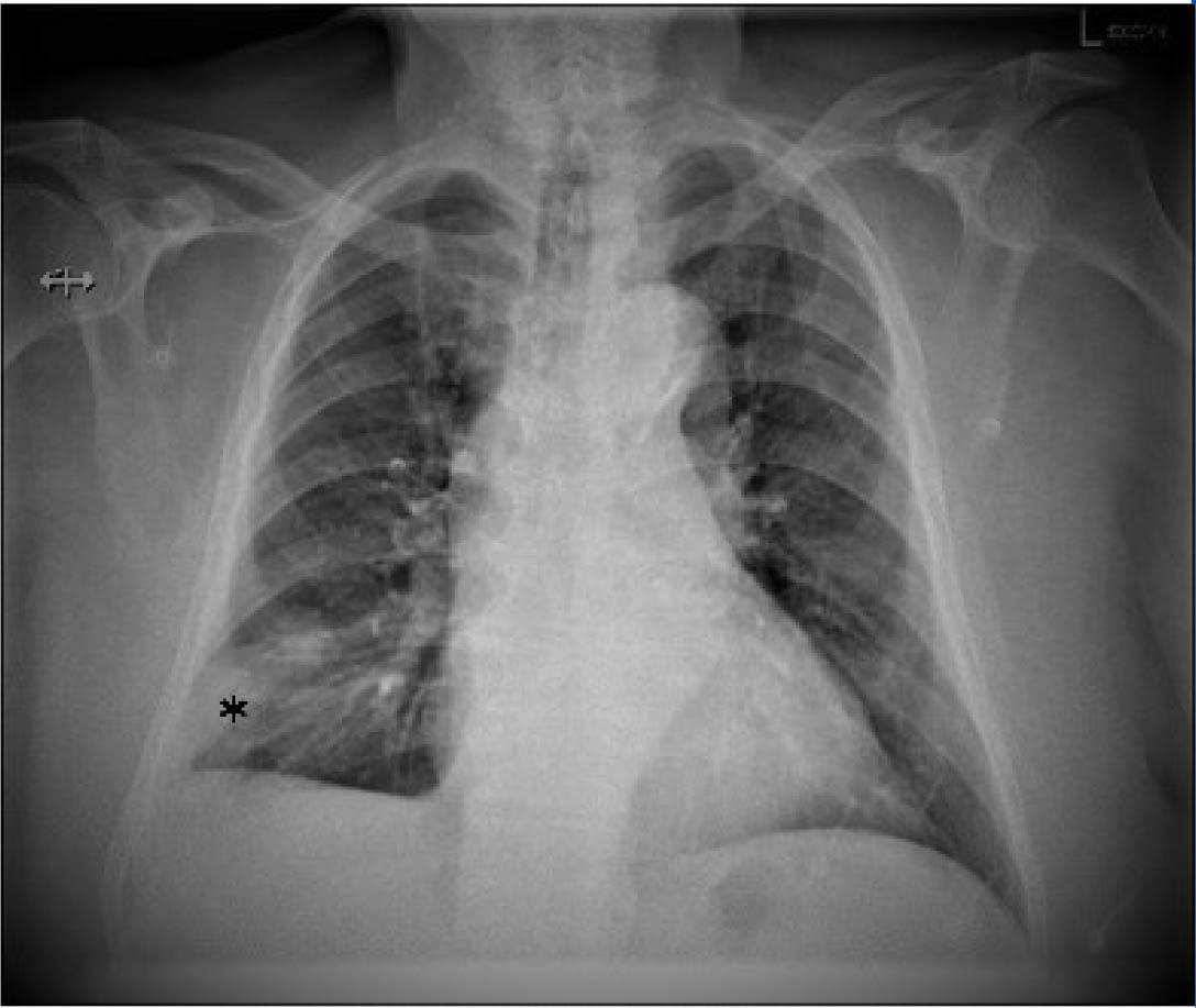 Chest x-ray that shows right lower lobe condensation opacity, without aerial bronchogram suggestive of pulmonary infarct.