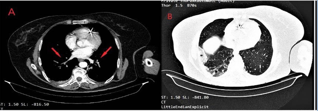 Contrast pulmonary CT scan. Panel A: multiple bilateral thrombi in segmental and subsegmental pulmonary arteries; Panel B: alveolar and interstitial densification areas localized in the lower inferior right lobe – probably pulmonary infarcts.