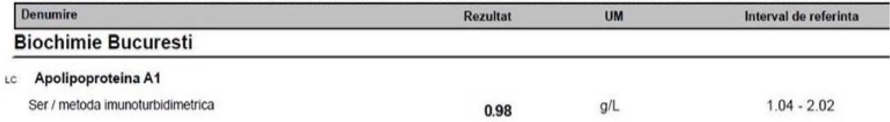 The current coronary angiography did not reveal any acute lesions. Given all the history anamnesis and clinical and paraclinical data, the next diagnostic step was the dosage of apolipoprotein A1, the value being below the reference range (Figure 1).