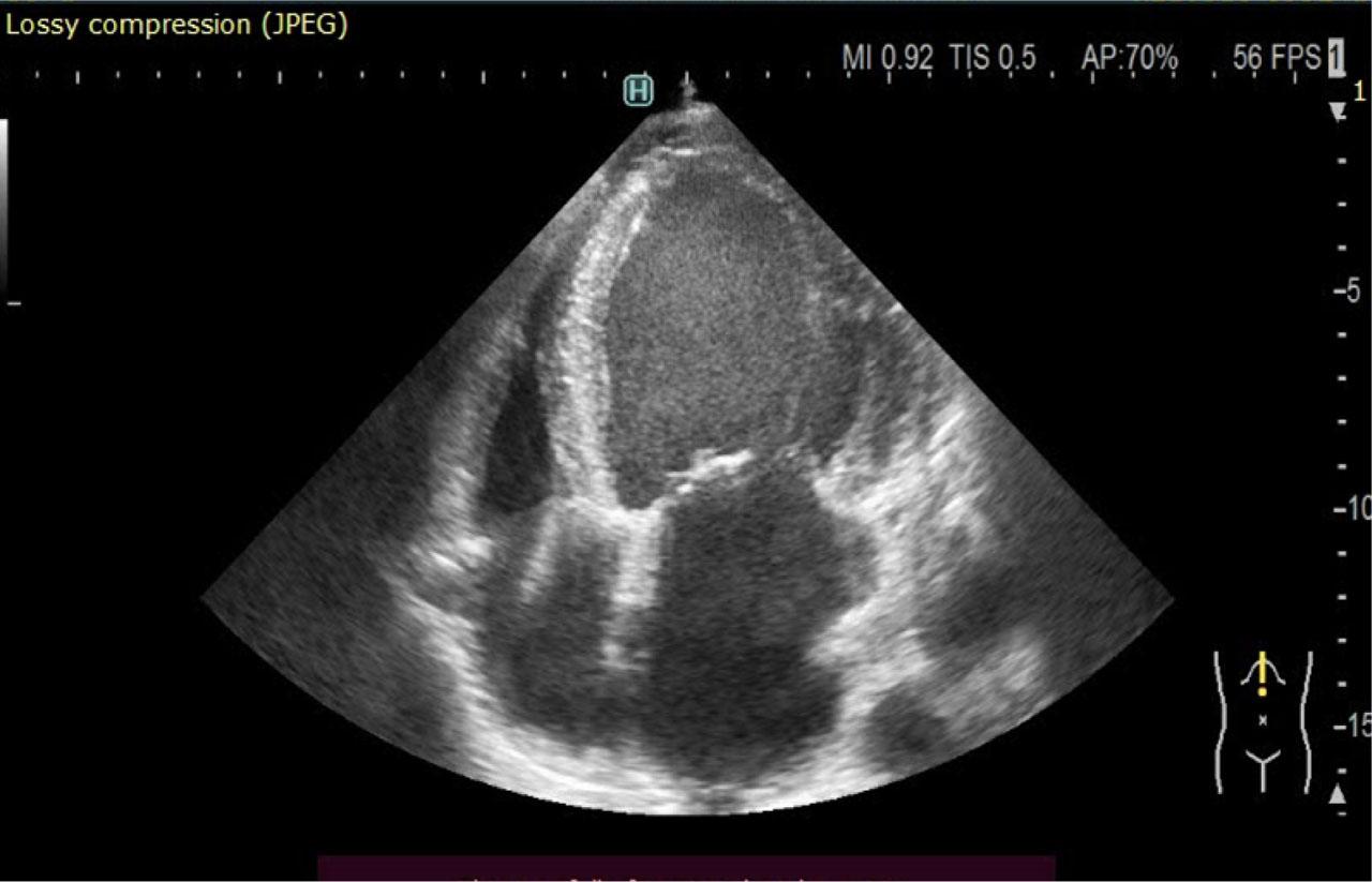 Transthoracic echocardiography apical 4C view—dilated left ventricle with significantly impaired systolic function. ICD lead visible in the right chambers.