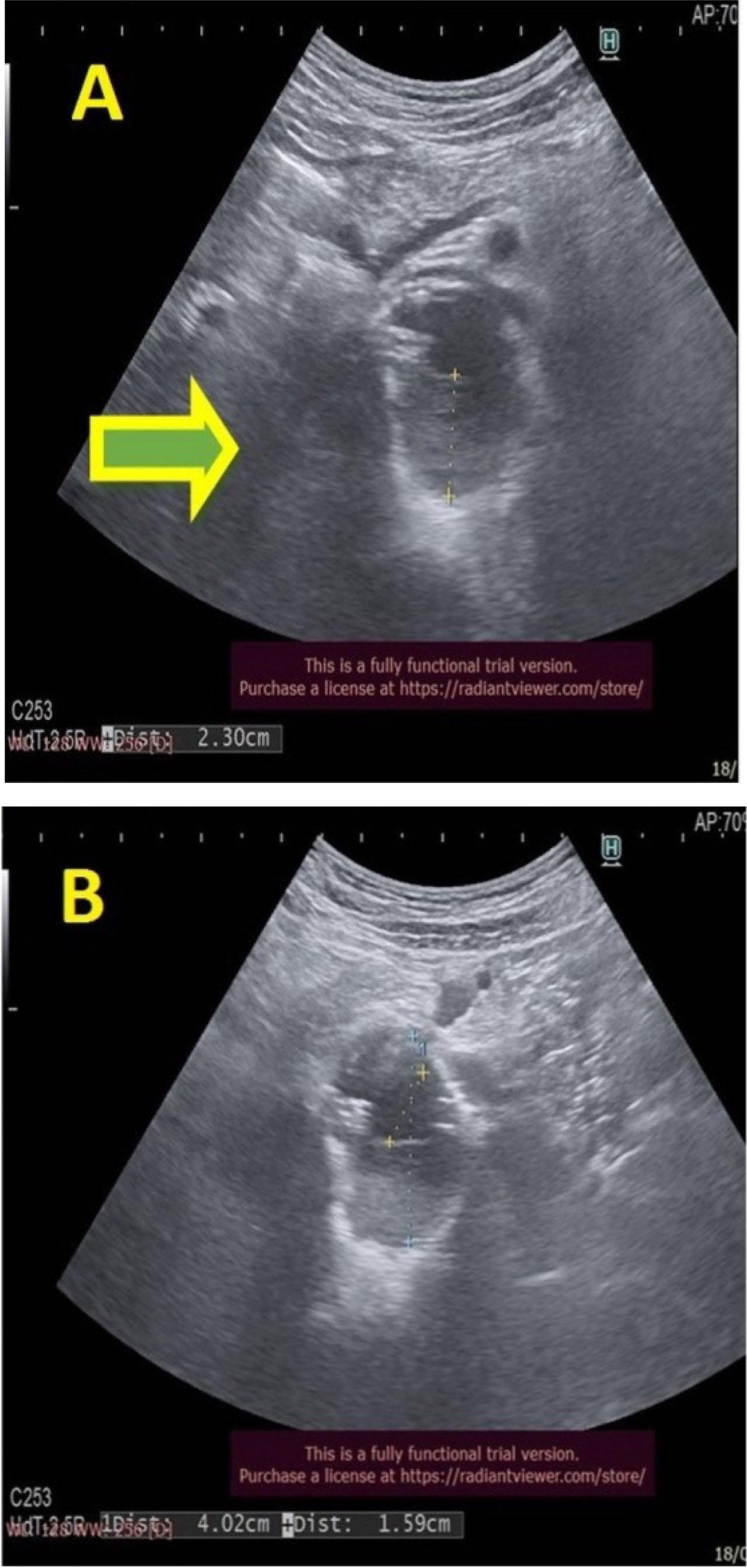 The abdominal echography objectified the persistence of thrombosed aneurysm in the abdominal aorta, with the appearance of a hyperechoic mass attached to the posterior wall of the aorta, which causes a significant obstruction of approximately two thirds of its lumen (Figure 4A). The patency of the renal arteries ostium is noticeable, observing even the proximal extremities of the stents at this level (Figure 4B), which protrude in the aortic lumen, with flow present at the Doppler examination.