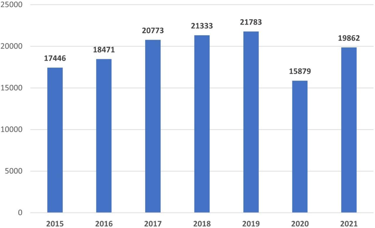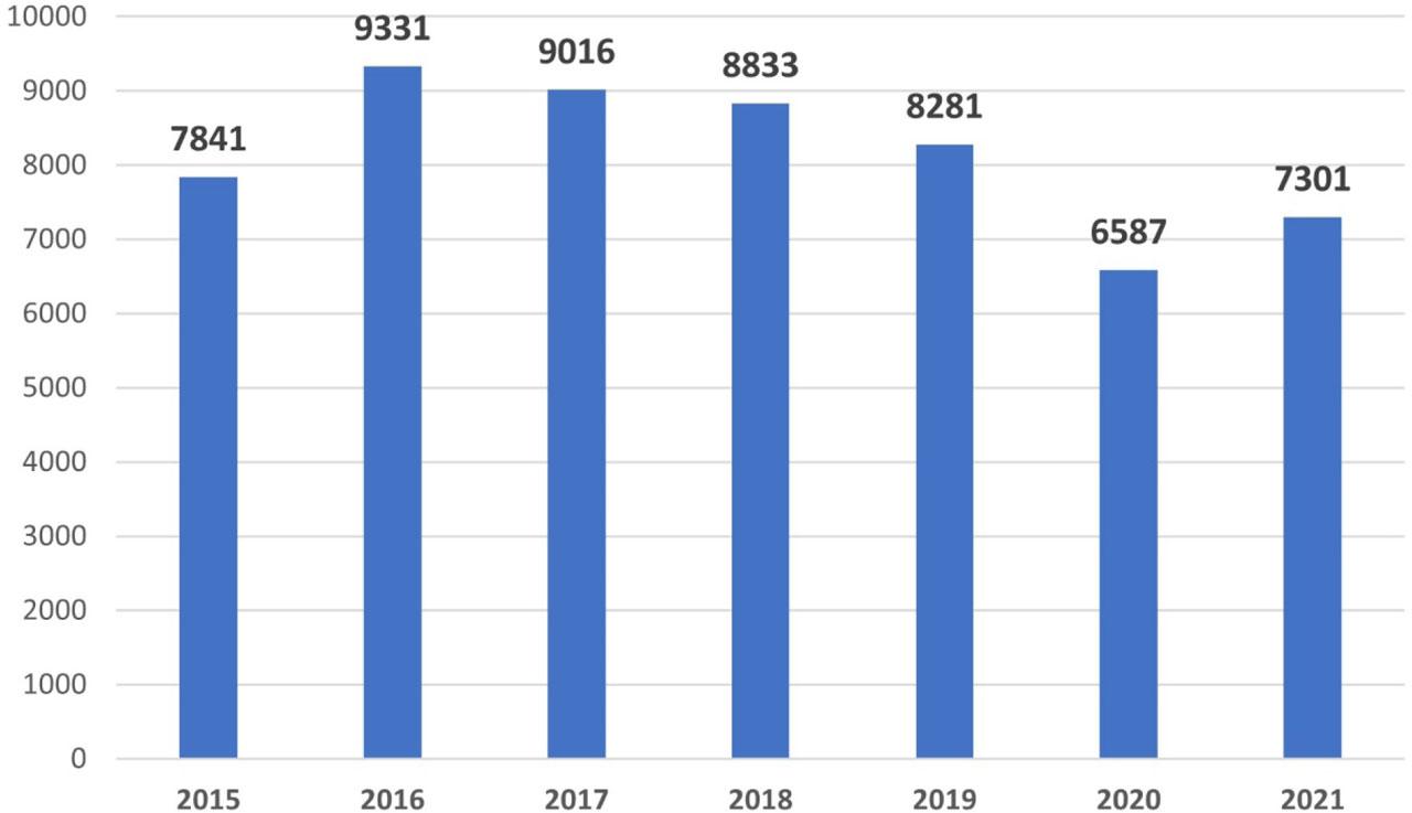 Total number of primary PCIs in STEMI patients from 2015 to 2021 in interventional centers from Romania (PCI: percutaneous coronary intervention; STEMI: ST segment elevation myocardial infarction)