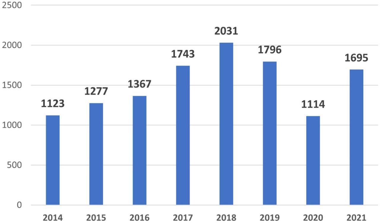 Total number of percutaneous coronary interventions from 2014 to 2021 in Romania.