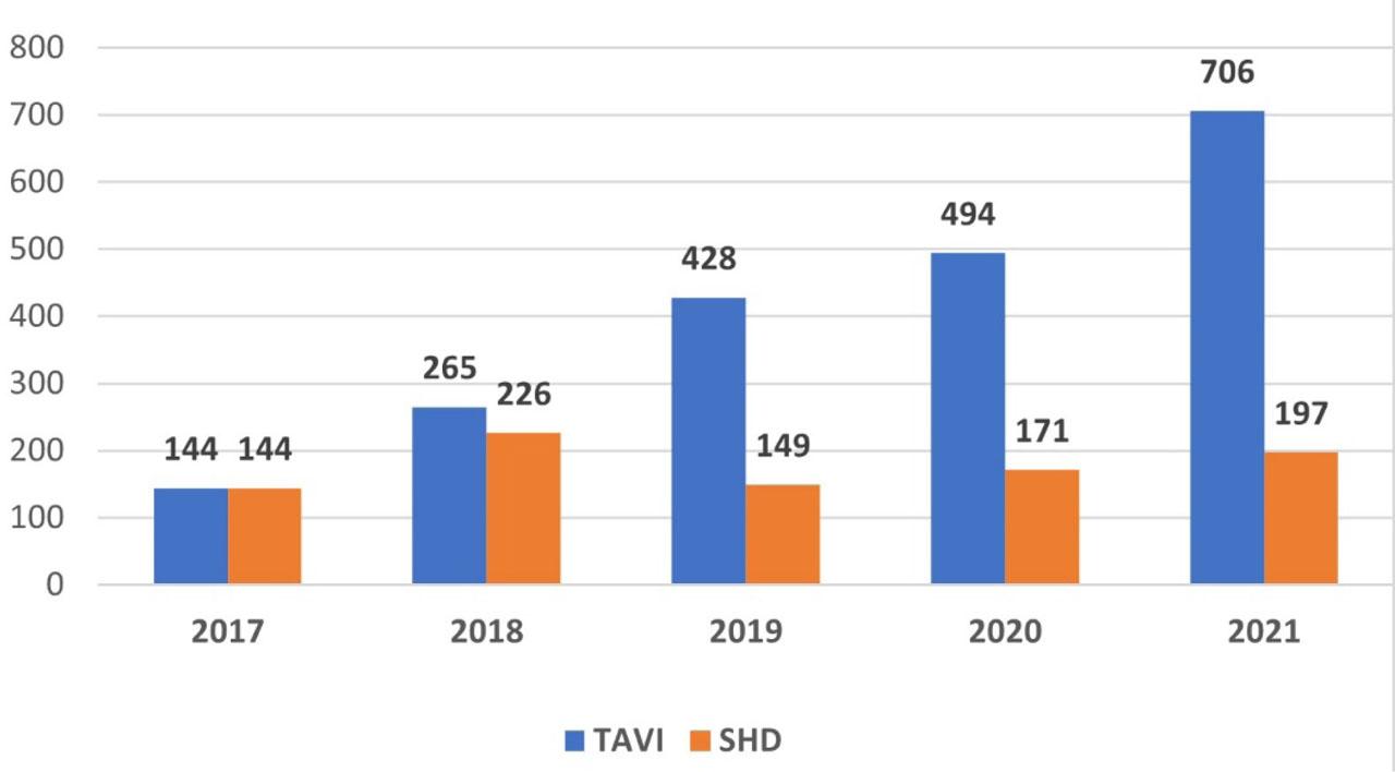 Total number of TAVI and interventions in SHDs performed from 2017 to 2021 in Romania (TAVI - transcatheter aortic valve implantation, SHDs – structural heart diseases)