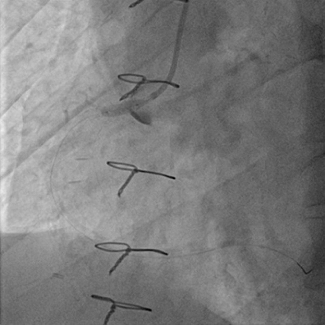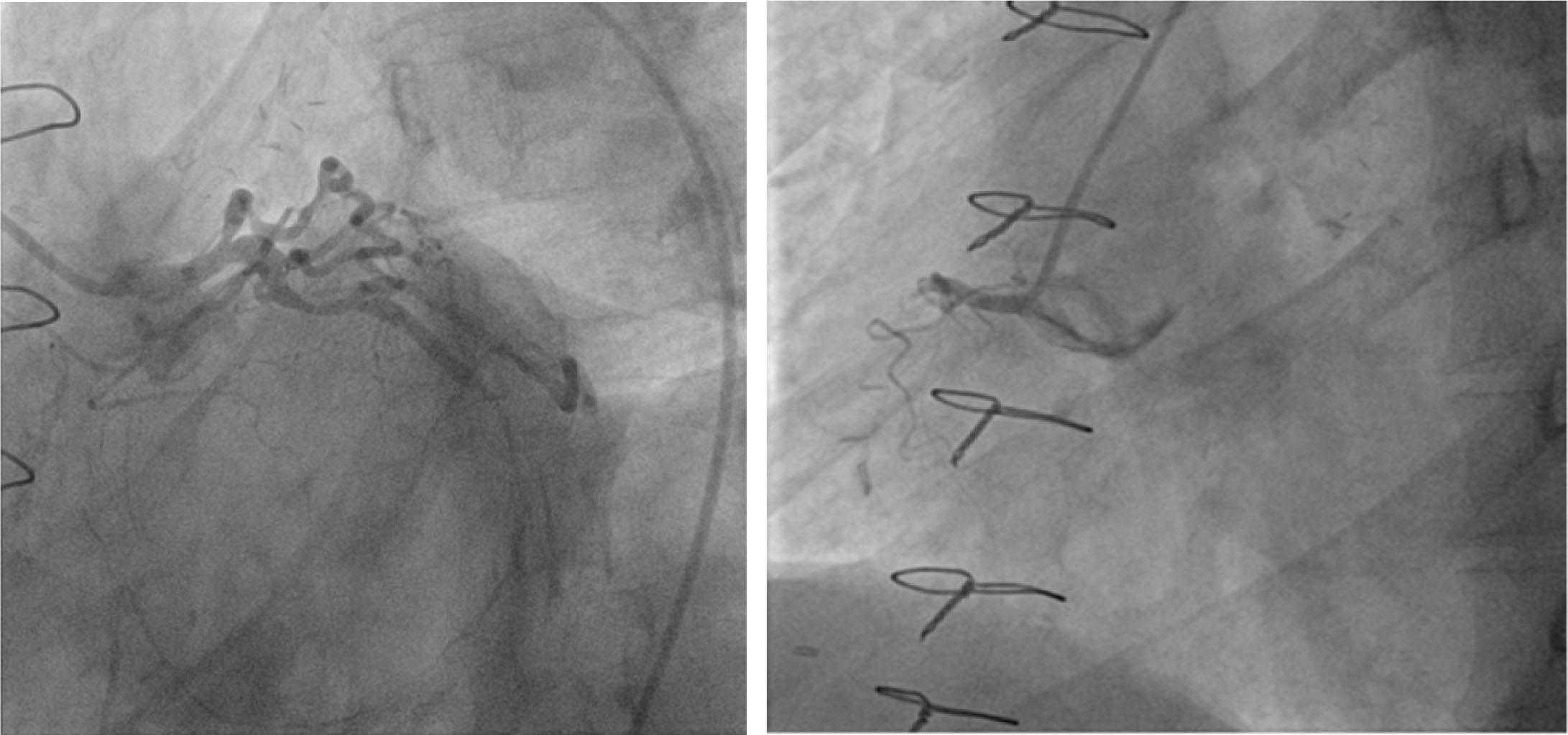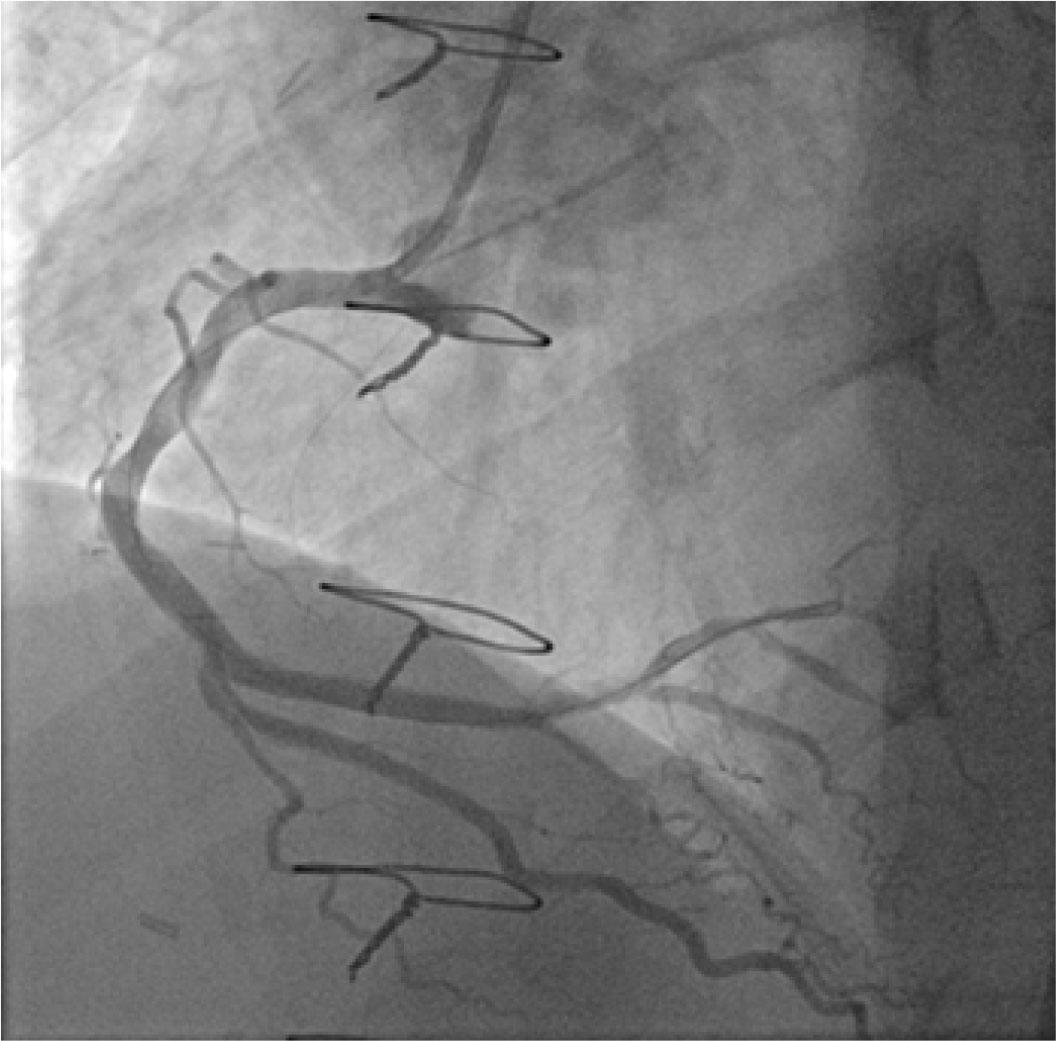 We report the case of a 55-year-old male patient who presented with sudden onset chest pain with cervical radiation that began five hours earlier. His prior medical history included hypertension, diabetes mellitus, and single-vessel coronary artery disease (affecting the left anterior descendant artery [LAD) and first diagonal branch). In 2013, he underwent coronary artery bypass grafting (CABG) via a bilateral internal thoracic artery (BITA) “Y” grafting configuration with a left internal thoracic artery grafted to the LAD and the internal thoracic artery grafted to the first diagonal artery. On admission, ECG and emergent laboratory tests revealed ST segment elevation in inferior leads with elevated high-sensitivity troponin I and CK-MB.