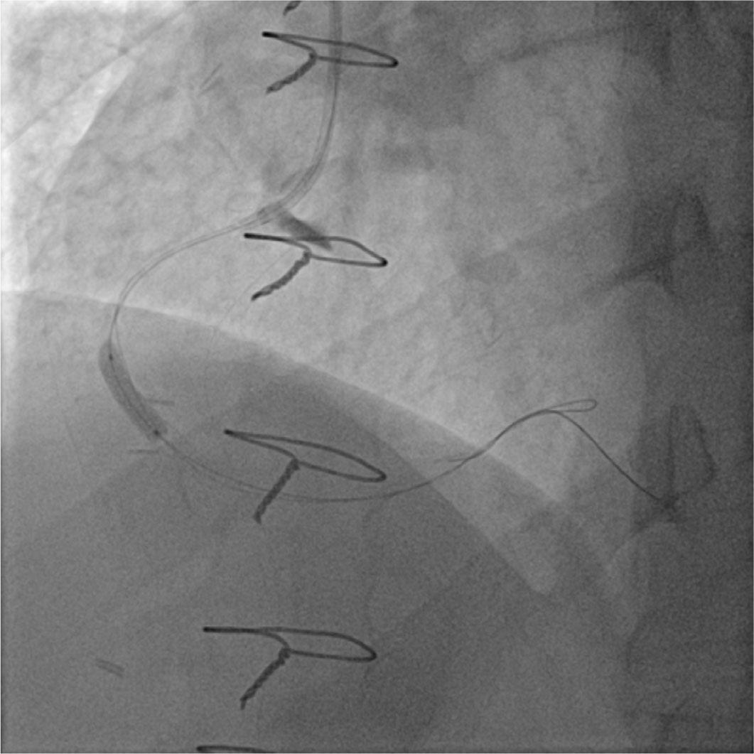 He was taken immediately to the catheterization laboratory. Transfemoral diagnostic coronary angiography using CORDIS DIAGNOSTIC 6F JL4 (IndiaMART) and JR4 (Oscor’s Angios) catheters revealed patency of LAD graft, significant stenosis of the proximal left circumflex coronary artery (LCX) followed by chronic total occlusion of the distal segment, and complete thrombotic occlusion of the proximal right coronary artery (RCA) with retrograde filling of distal RCA through collaterals from LAD (Figure 1). Consequently, we proceeded to PCI to the proximal RCA. We used a CORDIS DIAGNOSTIC 6F JL4 (IndiaMART) guide catheter to engage the RCA, and an attempt was made to cross the culprit lesion with a 0.014” PT2 moderate support guidewire (Boston Scientific). The control contrast injection revealed a long spiral dissection of RCA (Type D according to the NHLBI classification) starting fromthe tip of the guide catheter with antegrade extension to the distal segment and evidence of thrombus in the mid-portion and slow flow. Subsequent angiogram revealed retrograde extension into the right aortic sinus of Valsalva and ascending aorta and dye retention extending more than 50 mm in the aortic wall, consistent with class III Dunning aortocoronary dissection (Figure 2).