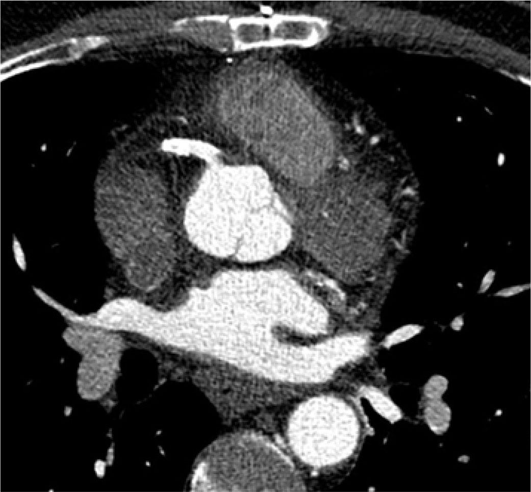 Computed tomography with contrast in a transverse section at RCA ostium level shows closed intimal flap, without evidence of false lumen.