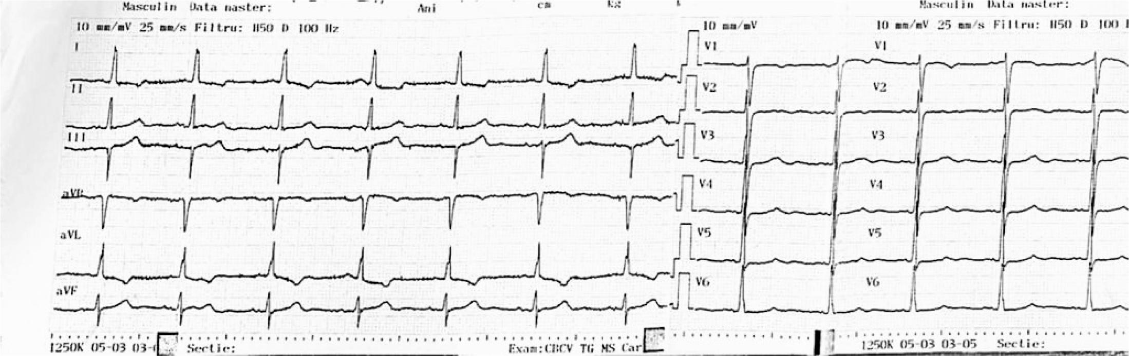 Electrocardiogram showing sinus rhythm, ventricular rate of 55/minute, and signs of left ventricular hypertrophy.