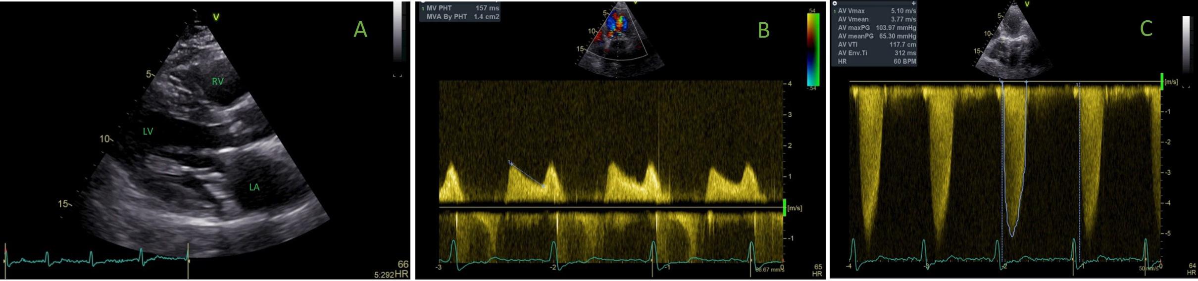 Transthoracic echocardiography in (A) parasternal long axis view showing severe mitral annular calcification and thickened mitral leaflet; (B) four-chamber view demonstrating moderate mitral valve stenosis by the pressure half-time method; and (C) five-chamber view showing severe aortic stenosis by continuous wave Doppler interrogation.