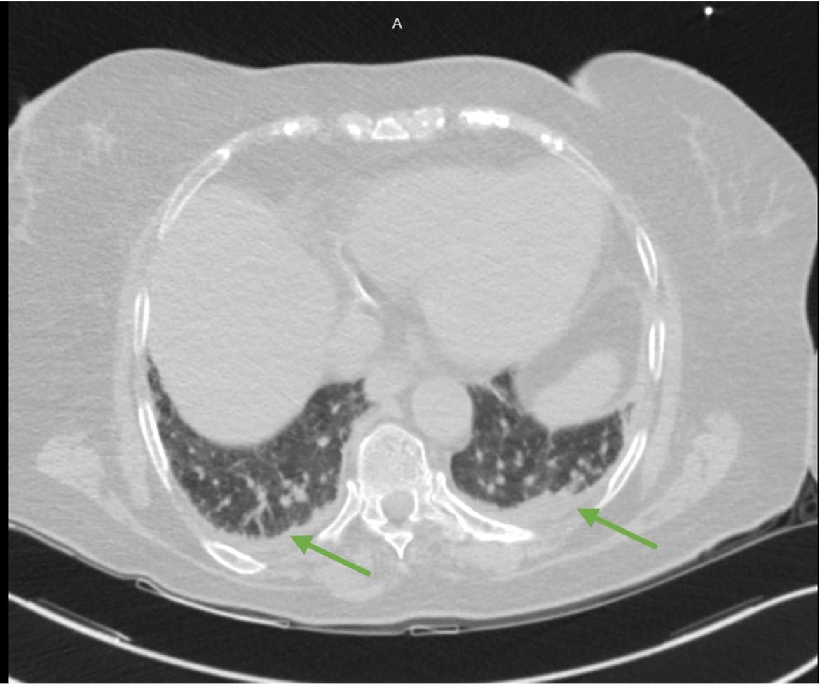 Computed tomography of the lung showing bilateral lower lobes consolidations. The arrows indicate subsegmental lower lobes consolidation with minimal pleural effusion.