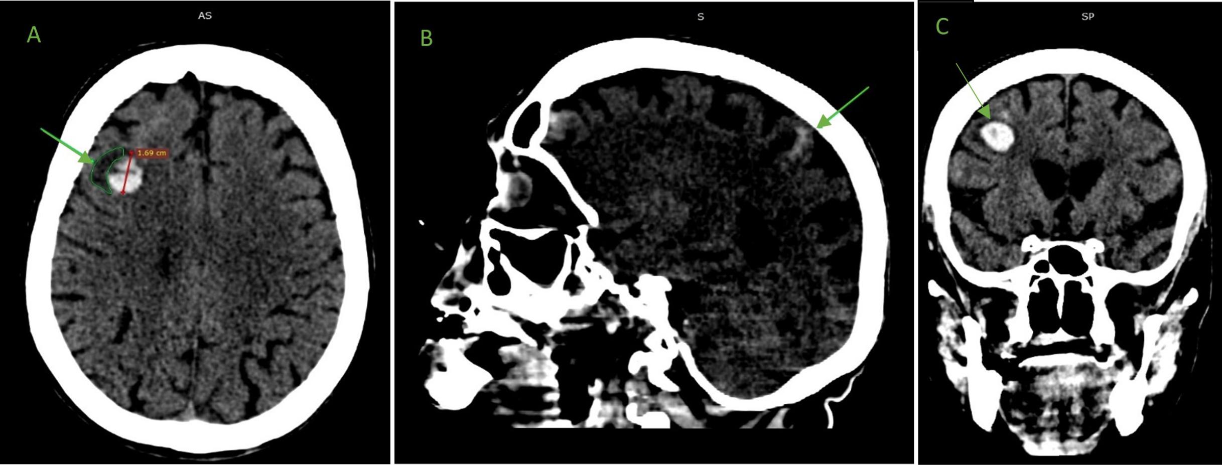Computed tomography of the brain showing (A) frontal intraparenchymal cerebral hemorrhage and perilesional edema in transversal view; (B) subarachnoid hemorrhage in sagittal view; and (C) frontal intraparenchymal hemorrhage in frontal view.