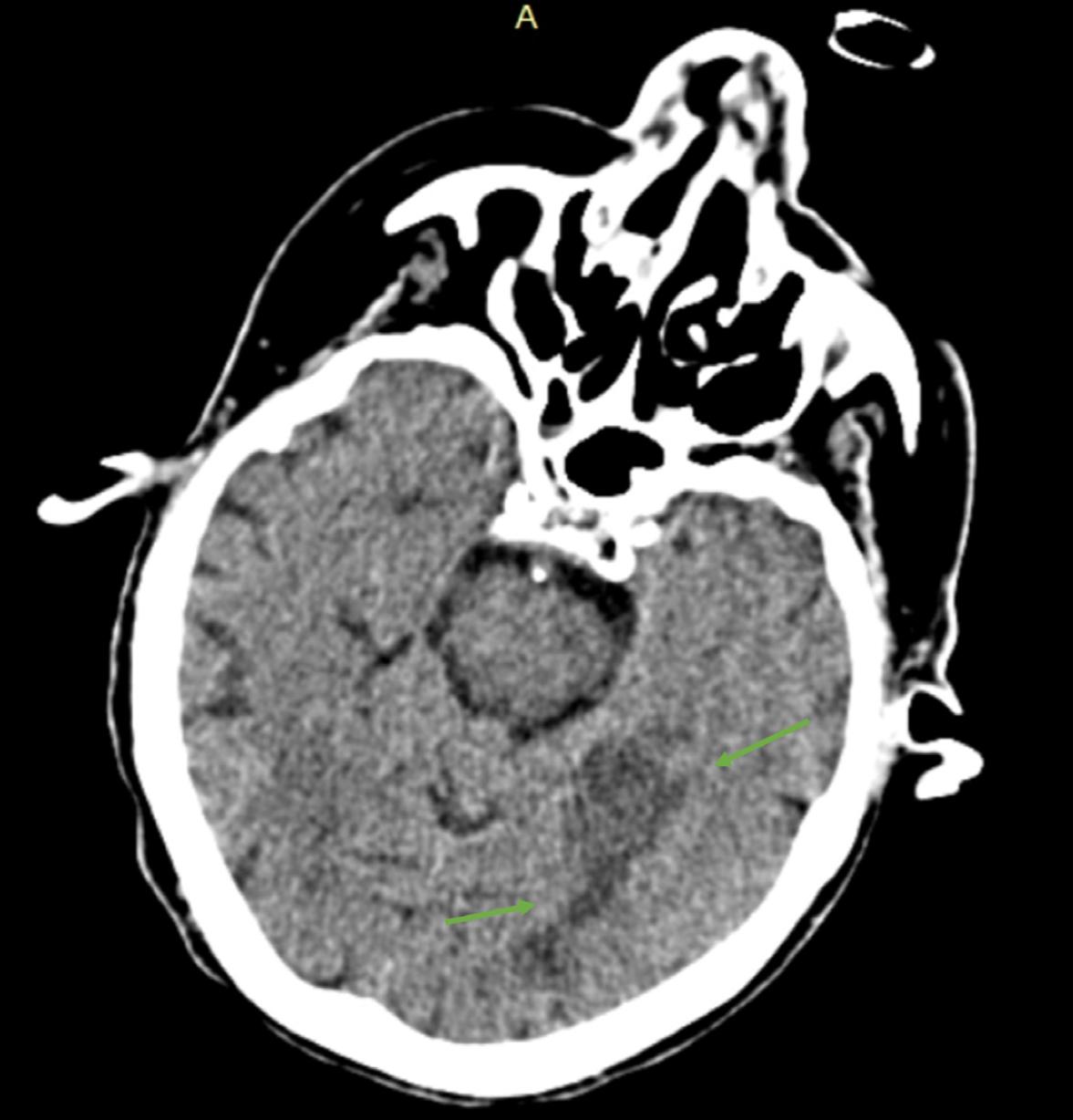 Repeated computed tomography of the brain showing new occipitotemporal cortical hypodensity and parenchymal swelling.
