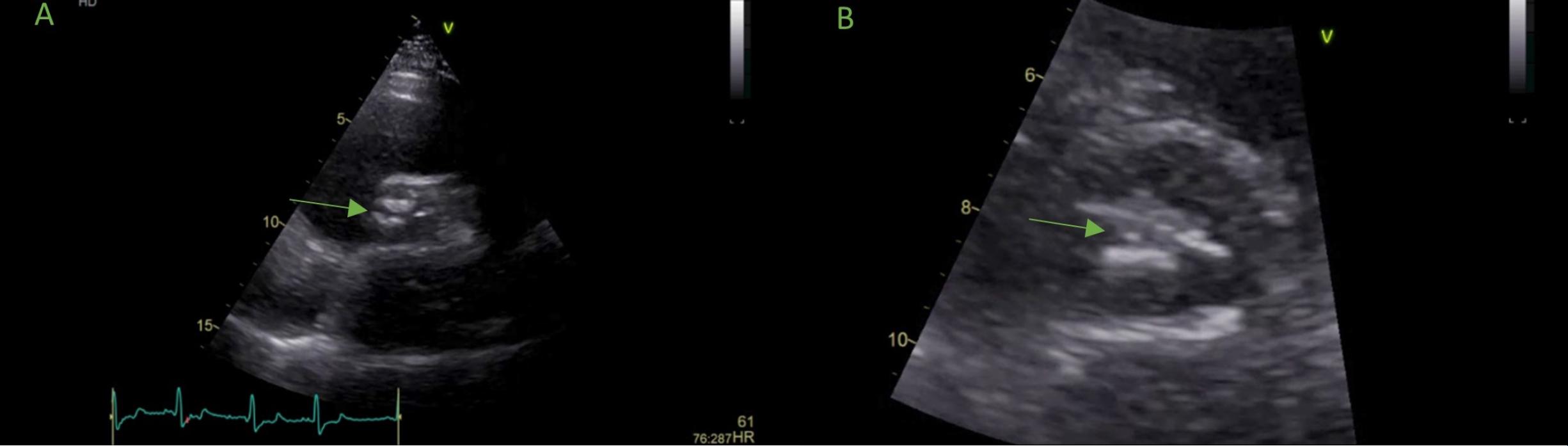 Initial (A) transthoracic echocardiography in short axis view showing calcified aortic valves and repeated (B) echocardiography with suspicion of a small mass attached to the aortic cusp.The arrows indicate (A) a degenerative tricuspid aortic valve and (B) a small mass attached to the aortic valve.