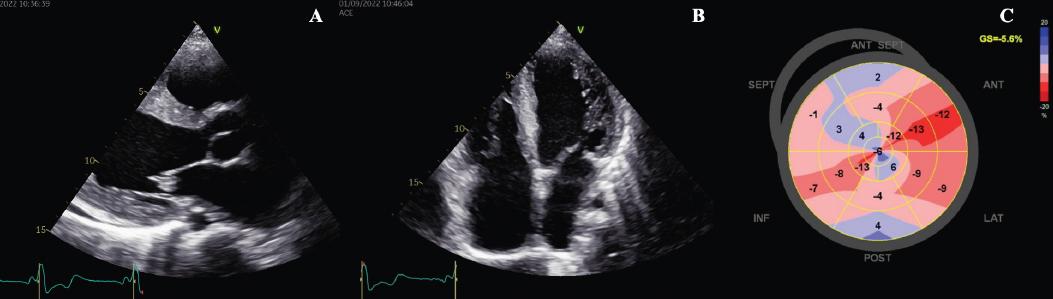 2D Echocardiography findings. A: Parasternal long axis with mild LVH (interventricular septum of 14 mm, posterior wall of 13mm). B: Apical 4 chamber view shows dilatation of all 4 chambers. C: Myocardial deformation bull’s eye showing severely reduced GLS of 05.6% with non-specific pattern.