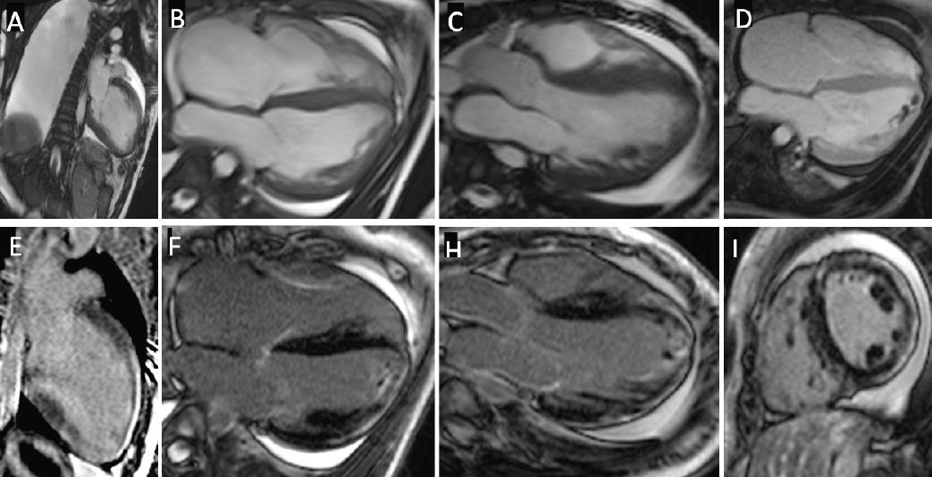 Contrast enhanced cardiovascular magnetic resonance findings. A, B, and C: Diastolic frames of cine images in 2, 4 and 3 chamber views showing a severely dilated left ventricle (LV) with interventricular septum hypertrophy. Large right pleural effusion and small circumferential pericardial effusion are also seen. D: Early Gadolinium enhancement showing multiple thrombi in the LV apex. E, F, G, and I: Late Gadolinium Enhancement (LGE) in 2, 4, 3 chambers and short axis views respectively showing extensive subepicardial LGE with a ring-like pattern.