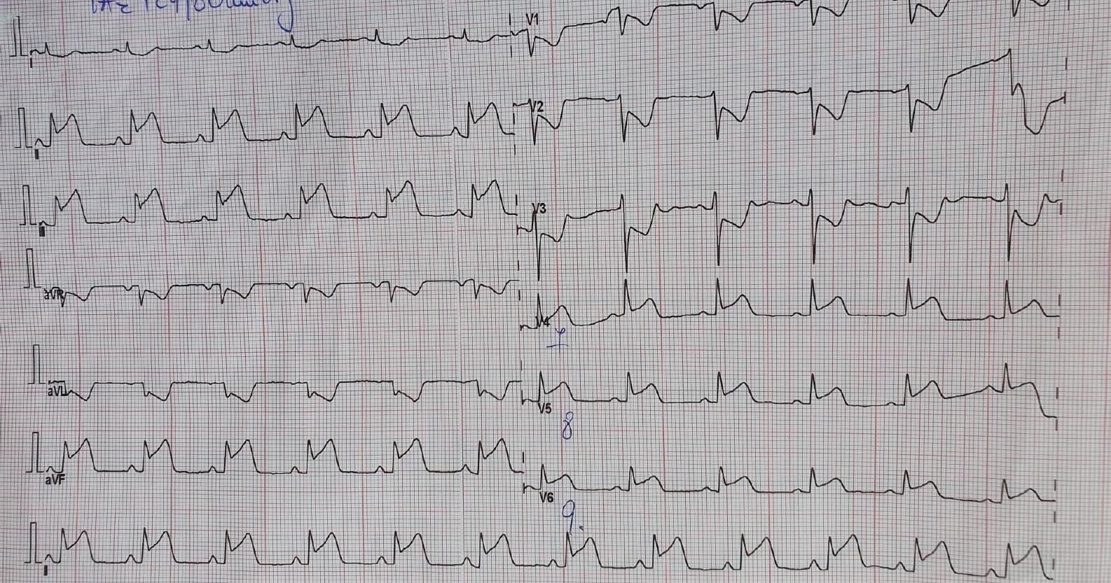 Resting electrocardiogram at admission. Sinus rhythm, 70 bpm; QRS axis, +60°; ST segment elevation DII, DIII, aVF, V7–V9 with reciprocal ST segment depression in V1–V3, aVL.
