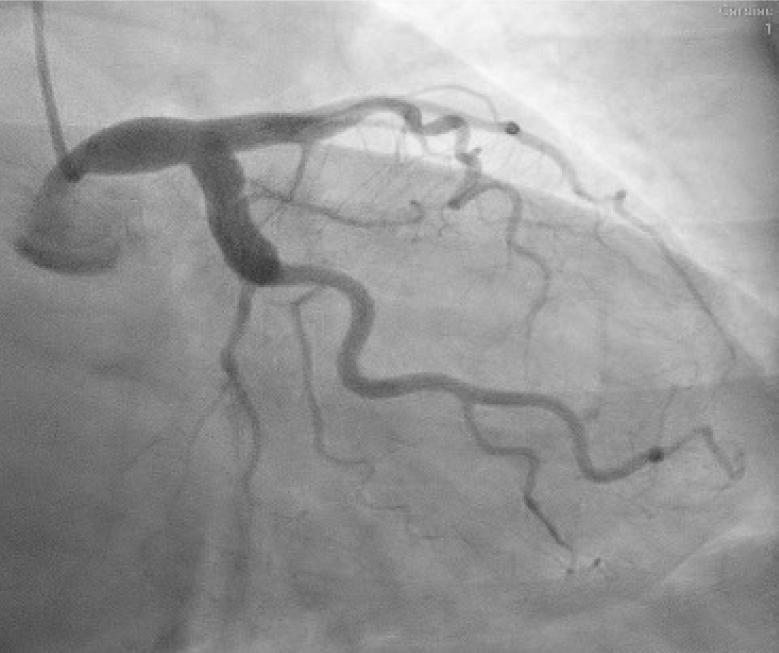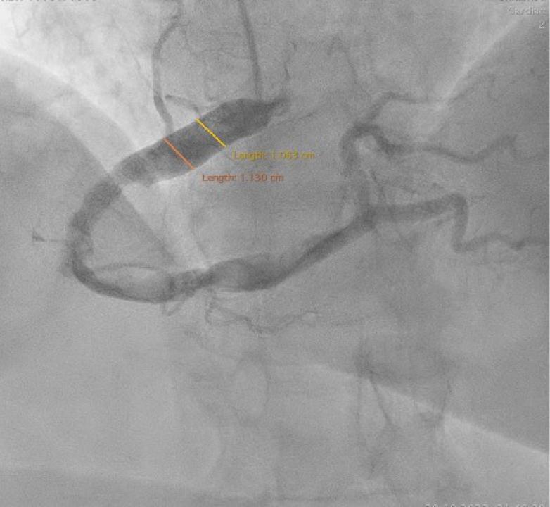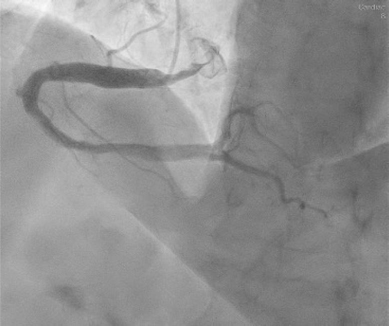 Cranial right anterior oblique projection of the left anterior descending artery—1 month later. In this projection, the left anterior descending artery can be seen, with ectasia on the entire length and a lack of significant atherosclerosis.