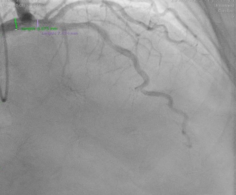 Cranial right anterior oblique projection of the left coronary artery. Optimal projection of the left anterior descending artery (LAD) showing an ectatic vessel, with a maximum diameter of 7.4 mm in the proximal segment.