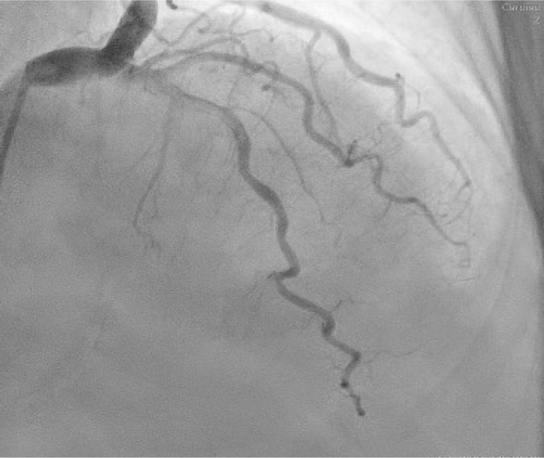 One month later, she was scheduled for a complete reevaluation, including invasive assessment of the coronary anatomy. Regarding clinical presentation, the patient did not report any angina or anginalike symptoms, and laboratory results showed a significant reduction of LDLc (75 mg/dl), but there was an increase in NTproBNP levels (336 pg/ml). The persistence of mild LV systolic dysfunction was noted, but without any new abnormalities.